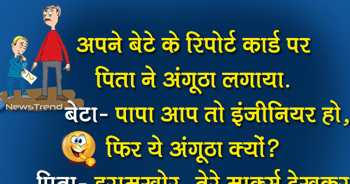 आजकल के भागदौड़ भरी इस जिंदगी में लगभग हर इंसान तनाव में रहता है. तनाव में रहने पर इंसान को तरह-तरह की बीमारियां घेरने लगती हैं. डॉक्टरों की मानें तो व्यक्ति तभी स्वस्थ रहेगा जब वह अंदर से खुश रहेगा और फिर वो कहावत तो आपने सुनी ही होगी कि ‘laughter is the best medicine’. इसलिए आज के इस पोस्ट में हम आपके लिए कुछ ऐसे मजेदार चुटकुले लेकर आये हैं जो आजकल सोशल मीडिया पर धमाल मचा रहे हैं और हमें यकीन है कि इन्हें पढ़ने के बाद आप भी हंसे बिना रह नहीं पाएंगे. तो देर किस बात की है? चलिए शुरू करते हैं हंसने-हंसाने का ये सिलसिला.