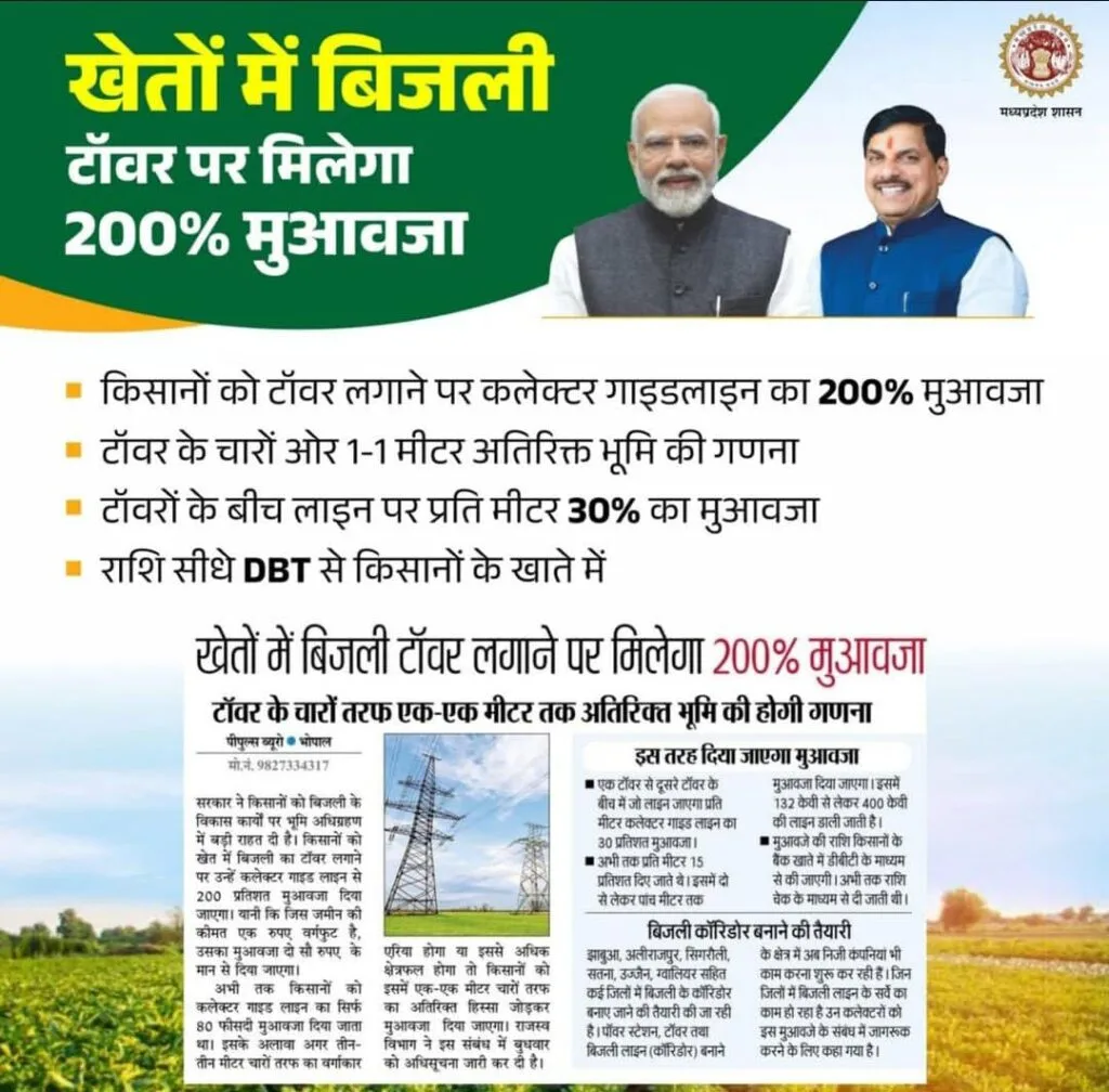 सरकार ने किसान भाइयों के लिए एक बड़ा फैसला किया है। अब जिन किसानों की जमीन पर बिजली के टॉवर लगाए जाएंगे, उन्हें कलेक्टर गाइड लाइन के अधार पर 200 % मुआवज़ा दिया जाएगा। आइए जानते हैं पूरी खबर।