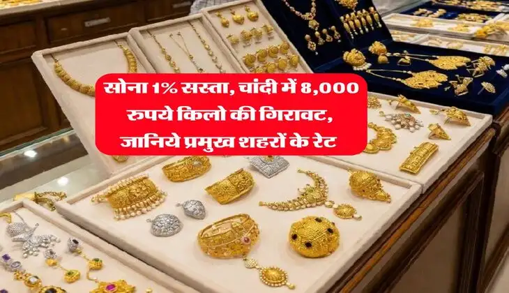 Gold-Silver Rate Today : सोने और चांदी की कीमतों में लगातार उठक पटक जारी है। शनिवार और रविवार बाजार बंद रहने के बाद आज सोमवार को हफ्ते के पहले ही दिन सोने और चांदी कीमतों में बड़ी गिरावट देखने को मिली है। बाजार खुलते ही सोना (Sone ke rate) एक प्रतिशत से ज्यादा सस्ता हुआ है। वहीं चांदी ₹8000 फिसल कर नीचे आ गई है। आइए नीचे खबर में जानते हैं कि देश के प्रमुख शहरों में सोने चांदी का ताजा भाव क्या चल रहे हैं।