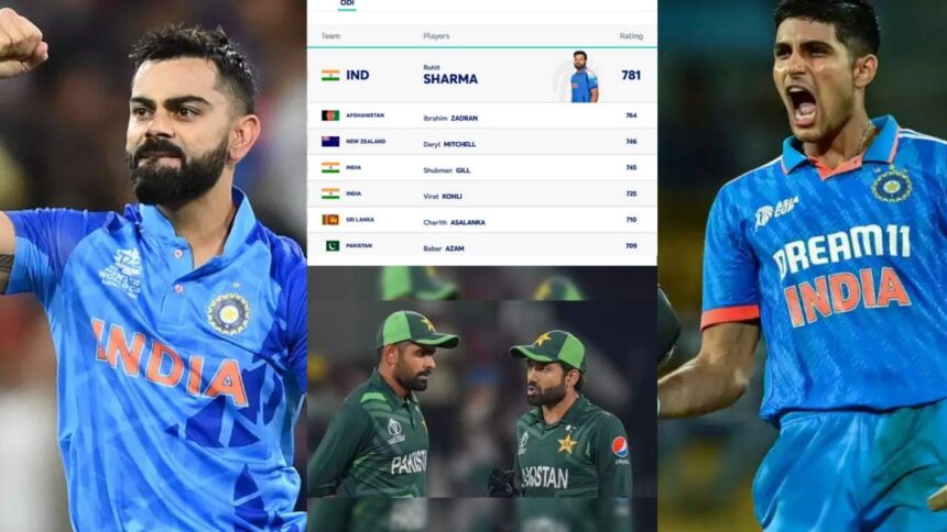 ICC ने बुधवार को रैंकिंग जारी की जिसमे रोहित शर्मा 781 रेटिंग लेकर अभी भी दुनिया के नंबर 1 खिलाड़ी बने हुए है. वह भी रैंकिंग में पहले पायदान पर बने हुए है. वही विराट कोहली को इस बार एक स्थान का फायदा मिल गया है. उनकी रेटिंग तो 725 की ही है, छठे स्थान से सीधे पांचवे नंबर पर पहुँच चुके है. अफगानिस्तान के इब्राहिम जादरान 764 की रेटिंग के साथ दूसरे नंबर पर कब्जा जमाए हुए हैं. न्यूजीलैंड के डेरिल मिचेल 746 की रेटिंग लेकर तीसरे स्थान पर हैं. टीम इंडिया के कप्तान अभी चौथे नंबर पर है. इस तरह इस रैंकिंग में हार्ट के 3 बल्लेबाज टॉप 5 में दबदबा बन चुका है.