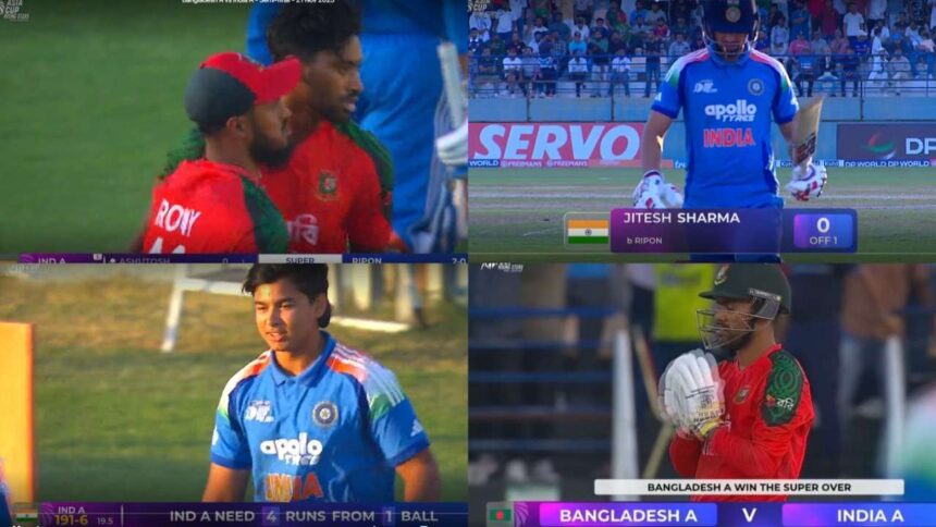एशिया कप राइजिंग स्टार्स 2025 इंडिया ए की टीम (IND A vs BAN A) ने सेमीफाइनल में जगह बनायीं है. इंडिया ए की टीम का मुकाबला बांग्लादेश ए का मुकाबला हो गया है. इंडिया ए की टीम ने टॉस जीता और पहले गेंदबाजी का चुनाव किया. बांग्लादेश का यह टूर्नामेंट बहुत शानदार रहा वही भारतीयत टीम पाकिस्तान से हार गयी. इंडिया ए की टीम ने बांग्लादेश (IND A vs BAN A) के खिलाफ अंतिम 2 ओवर में जबरदस्त बल्लेबाजी कर 20 ओवर में 194 रन बनाया. वही भारतीयत टीम ने इस लक्ष्य को बराबरी कर सुपर ओवर में बुरी तरह से हार गयी. हार के पीछे कप्तानी के बड़ी कमी नजर आई.