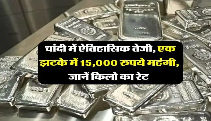 Silver Rate Today : चांदी की कीमतों में तूफानी तेजी देखने को मिल रही है। बीते साल चांदी ने 164% का रिटर्न दिया है। बीते 10 साल के आंकड़ों पर नजर डालें तो चांदी में इतनी बढ़ोतरी नहीं हुई है, जो कि इस साल हुई है। आज चांदी की कीमतों (chandi rate) में ऐतिहासिक बढ़ोतरी देखने को मिली है। एक झटके में सिल्वर का रेट ₹15000 उछाल है। भाई नीचे खबर में विस्तार से जानते हैं।