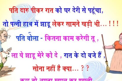 मज़ेदार जोक्स- पति दारू पीकर रात को घर देरी से पहुंचा, तो पत्नी हाथ में झाड़ू लेकर सामने